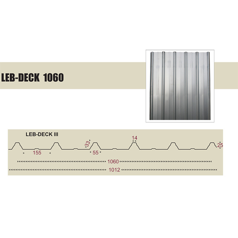 Τα τραπεζοειδή φύλλα LEB-DECK παράγονται σε χάλυβα γαλβανιζέ, aluzinc, ή προβαμμένο.