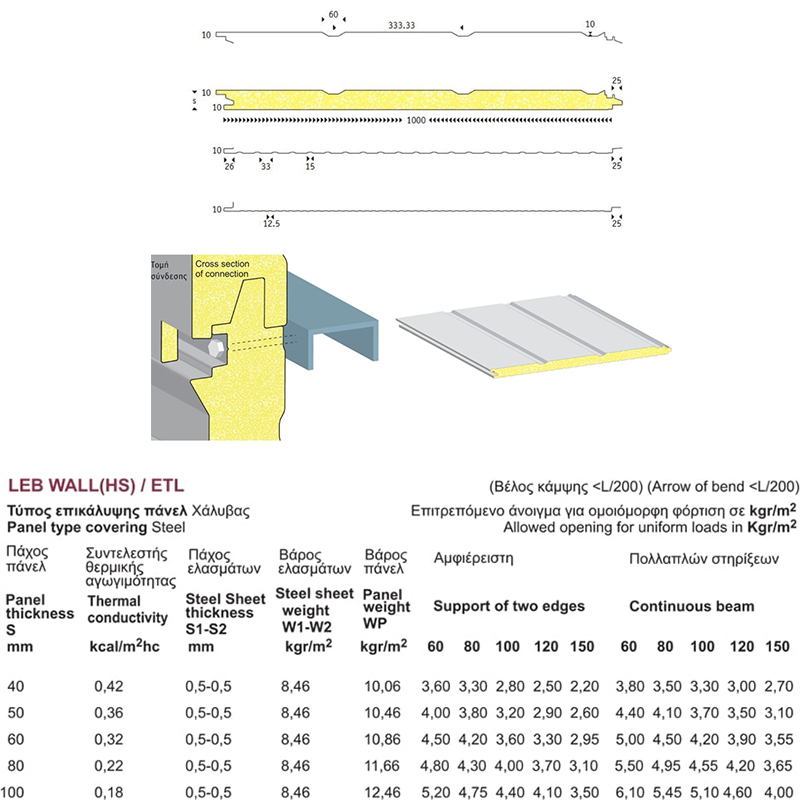 Τα πάνελ τοιχοποιίας Leb Wall (HS) ETL είναι σύνθετα θερμομονωτικά πάνελ κρυφής στήριξης, αποτελούμενα από δύο ελαφρά διαμορφωμένα, γαλβανισμένα και προβαμμένα μεταλλικά ελάσματα και από μονωτικό δομικό πυρήνα σκληρού αφρού πολυουρεθάνης.