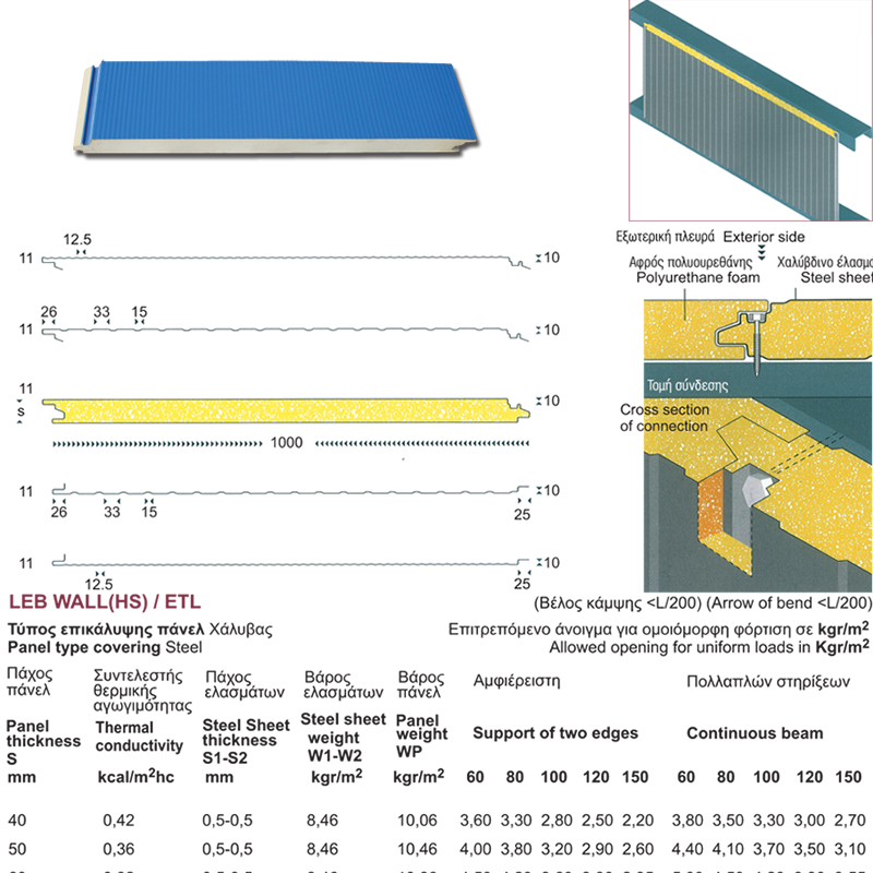 Τα Πάνελ LEB-WALL κρυφής στήριξης Leb Wall (HS) είναι σύνθετα θερμομονωτικά πάνελ, αποτελούμενα από δύο ελαφρά διαμορφωμένα, γαλβανισμένα και προβαμμένα μεταλλικά ελάσματα και από μονωτικό δομικό πυρήνα σκληρού αφρού πολυουρεθάνης, παραγόμενα με μη επιβαρυντικά υλικά για το περιβάλλον και με αυστηρούς ποιοτικούς ελέγχους, έτσι ώστε: