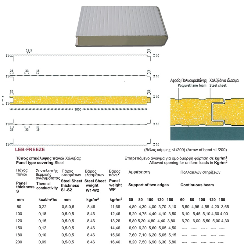 Τα θερμομονωτικά πάνελ ψυκτικών θαλάμων Leb-Freeze, είναι σύνθετα πάνελ, αποτελούμενα από δύο ελαφρά διαμορφωμένα, γαλβανισμένα και προβαμμένα μεταλλικά ελάσματα και από μονωτικό δομικό πυρήνα σκληρού αφρού πολυουρεθάνης.